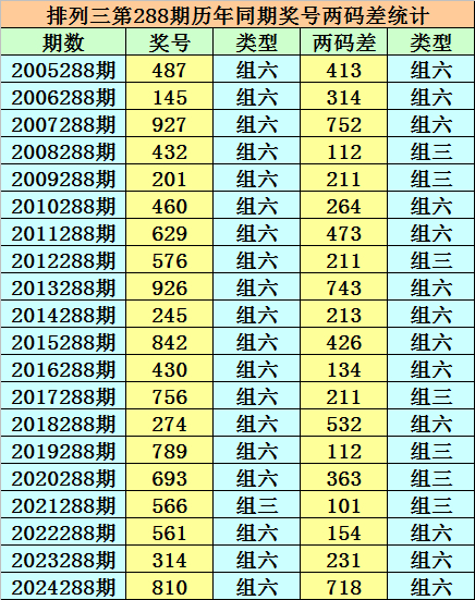 在排列三第288期历史同期开奖中,各号码两码差分别为:134、134、257、112、112、246、347、112、347、123、246、134、112、235、112、336、011、145、123、178;