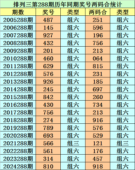 排列三从2004年开奖至今已开出7411期奖号了,其中第288期历史同期奖号出现20次,历年第288期分别开出号码:487、145、927、432、201、460、629、576、926、245、842、430、756、274、789、693、566、561、314、810。