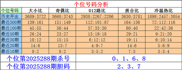 近期个位质数表现较热,上期轮空之后,本期适当关注质数号码再出;近期该位小 号出现相对较少,最近2期小 号连出,本期看好再出小 号。个位杀号:0168,胆码关注:237。