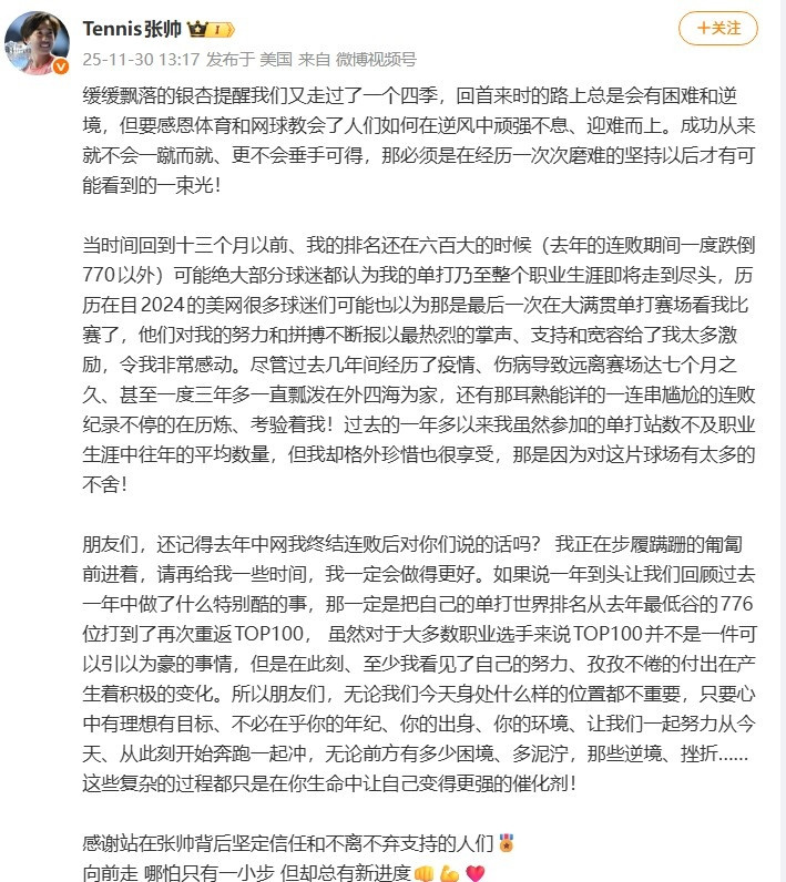 朋友们,还记得去年中网我终结连败后对你们说的话吗?我正在步履蹒跚的匍匐前进着,请再给我一些时间,我一定会做得更好。如果说一年到头让我们回顾过去一年中做了什么特别酷的事,那一定是把自己的单打世界排名从去年最低谷的776位打到了再次重返TOP100,虽然对于大多数职业选手来说TOP100并不是一件可以引以为豪的事情,但是在此刻、至少我看见了自己的努力、孜孜不倦的付出在产生着积极的变化。所以朋友们,无论我们今天身处什么样的位置都不重要,只要心中有理想有目标、不必在乎你的年纪、你的出身、你的环境、让我们一起努力从今天、从此刻开始奔跑一起冲,无论前方有多少困境、多泥泞,那些逆境、挫折……这些复杂的过程都只是在你生命中让自己变得更强的催化剂!