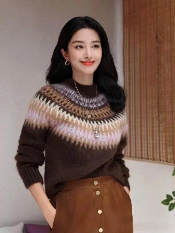 杨采钰的衣品是数一数二的! 穿提花毛衣+焦糖棕半裙, 时髦减龄