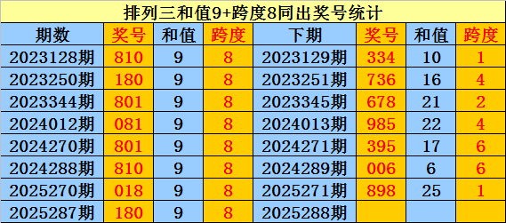 上期回顾:排列三第2025287期奖号:180。和值9,跨度8。