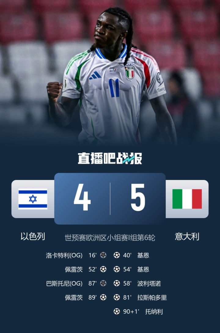 疯狂的比赛!意大利5-4绝杀以色列升至第二 基恩双响雷特吉3助攻