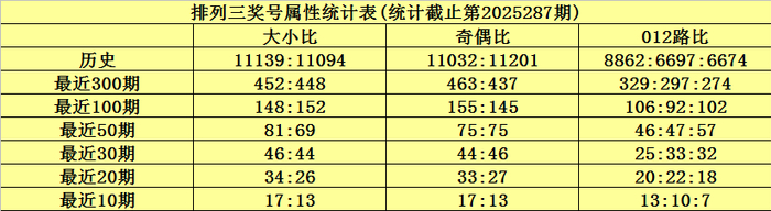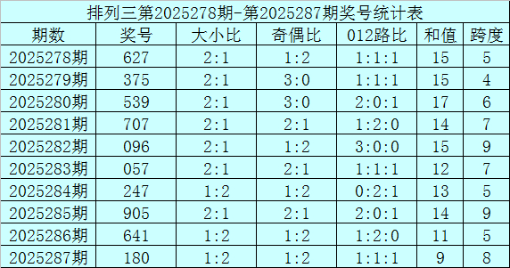 上期回顾:排列三第2025287期奖号为180,奖号012路比为1:1:1,奇偶比为1:2,大小比为1:2,和值为9,跨度为8。
