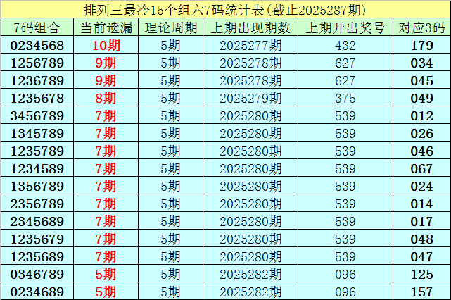(1)在排列三已开出的7411期奖号中(统计截止第2025287期),目前7码组六遗漏值最大的组合为:0234568,本期遗漏10期;
