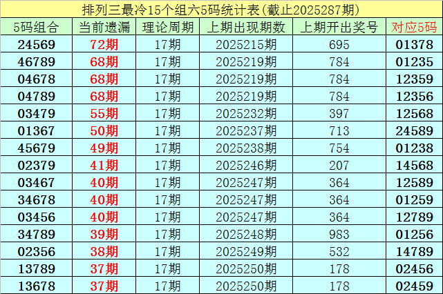 (4)排列三第2025287期遗漏值最大的十个5码组六组合解冻了0个;